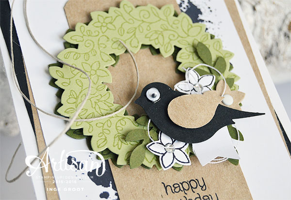 De mooie krans komt van de toepasselijke set Circle of Spring en is uitgestanst met de bijpassende Wonderful Wreath Framelits Dies. Ik heb de krans twee keer gestempeld en uitgestanst uit Pear Pizzazz en Mossy Meadow. De tag is geponst met de Banner Triple pons en de Ornate Tag Topper pons. Vogeltje is een goude ouwe ;o) en is geponst met de Bird Builder, een wiebeloogje maakt het vogeltje compleet.